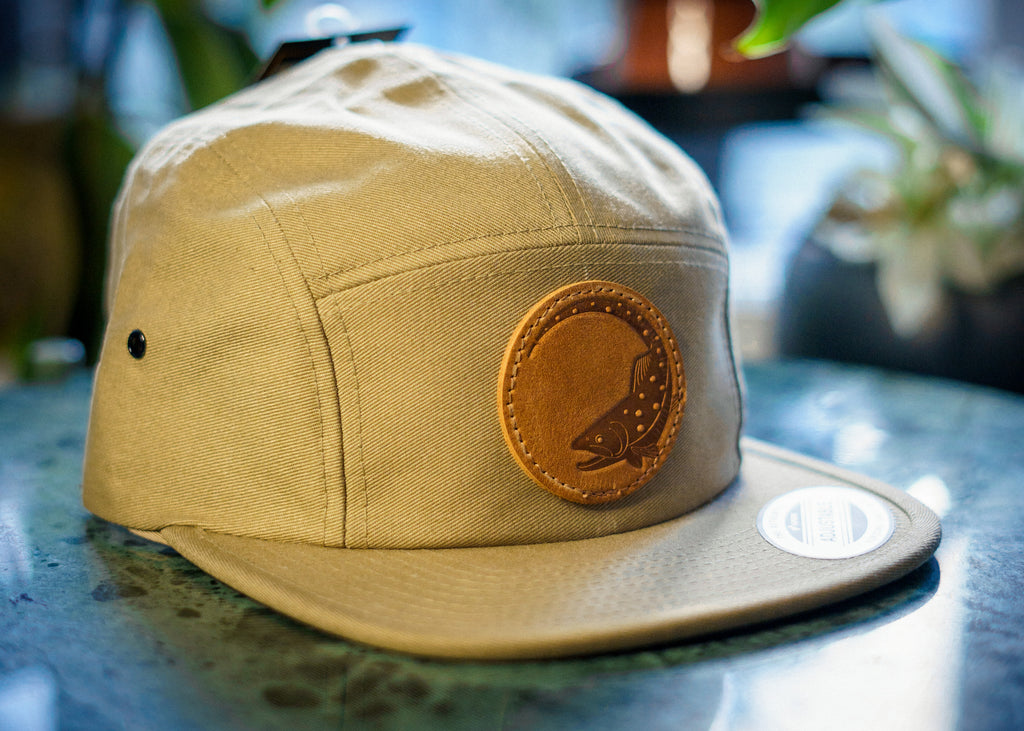 Mütsi esipaneelil Estrout Brothers-i logo jõeforelli kujutisega.